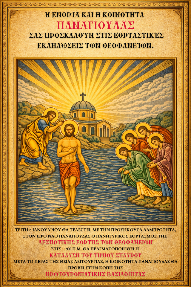 Η Ενορία και η Κοινότητα Παναγιούδας διοργανώνουν τις εορταστικές εκδηλώσεις για τη Δεσποτική Εορτή των Θεοφανείων, την Τρίτη 6 Ιανουαρίου, στον Ιερό Ναό Παναγιούδας.