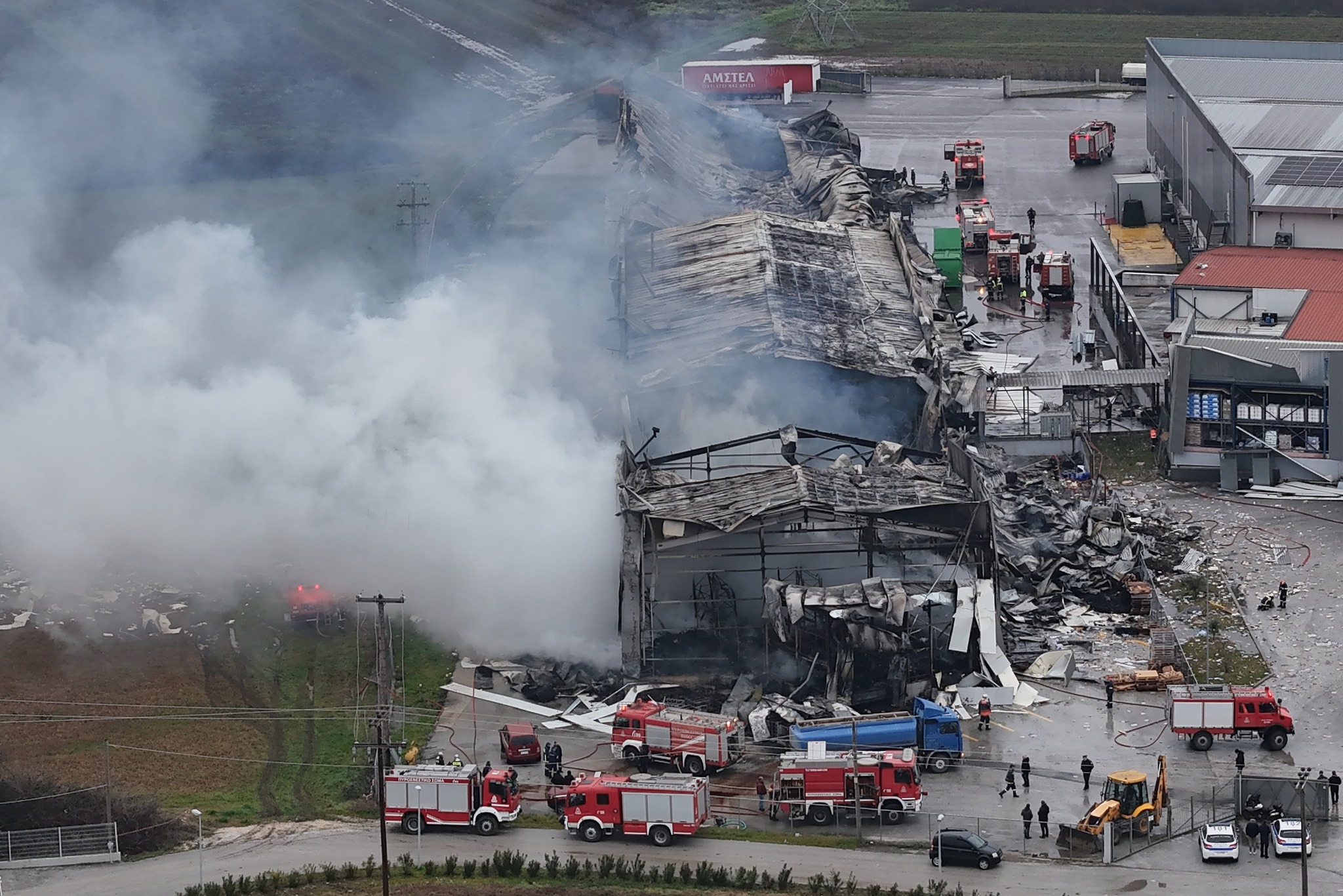 Οι εικόνες από ψηλά θυμίζουν εμπόλεμη ζώνη. Ένα μεγάλο τμήμα της επιχείρησης έχει καταστραφεί ολοσχερώς.