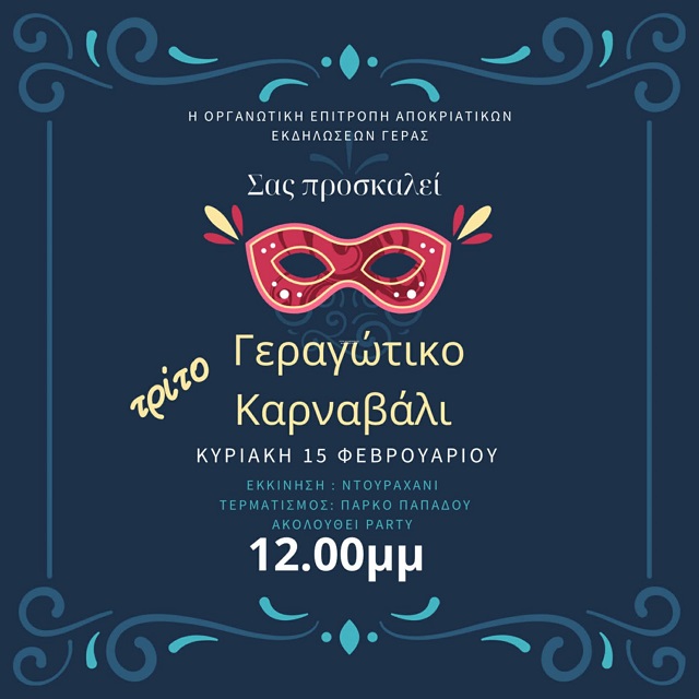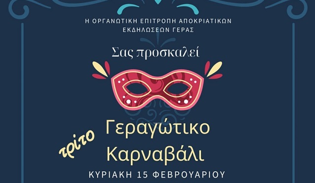 Η Οργανωτική Επιτροπή Αποκριάτικων Εκδηλώσεων Γέρα προσκαλεί κατοίκους και επισκέπτες να φορέσουν το χαμόγελό τους (και τη στολή τους!) και να γίνουμε όλοι μια μεγάλη γιορτινή παρέα. Σας περιμένουμε!