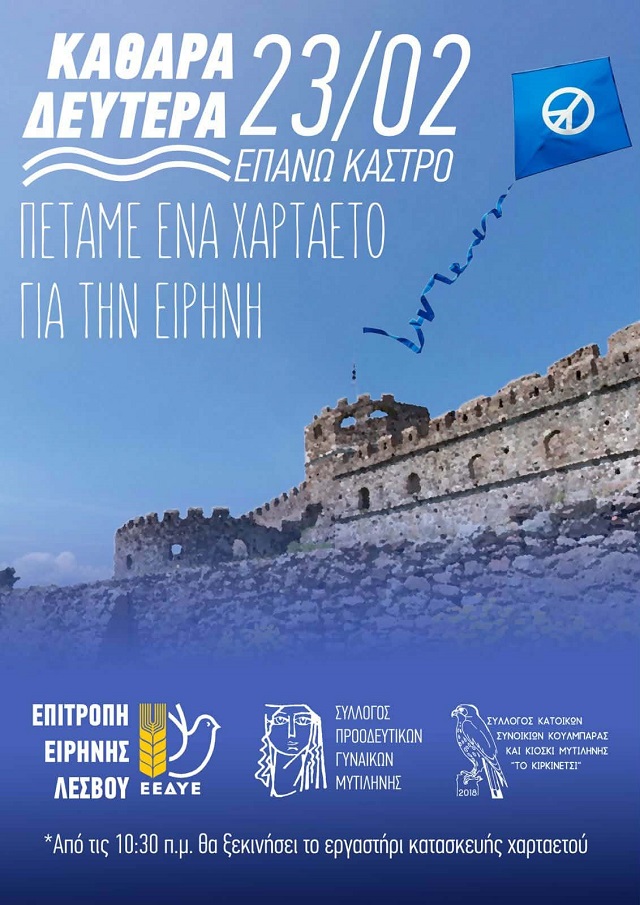 Στο ιστορικό και εμβληματικό τοπόσημο της Μυτιλήνης, στο πάνω κάστρο της πόλης, πετάμε φέτος, την Καθαρά Δευτέρα 23 Φεβρουαρίου, τον χαρταετό μας. Και μάλιστα φέτος πετάμε έναν ιδιαίτερο χαρταετό, αφιερωμένο στην αναγκαιότητα της εποχής μας, την ειρήνη.