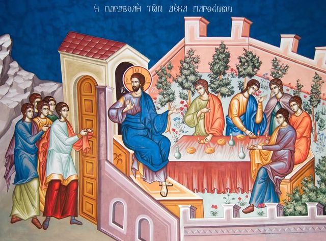 Ο Κύριός μας, ο Ιησούς Χριστός, όταν ανέβαινε στα Ιεροσόλυμα και πλησίαζε προς το εκούσιο Πάθος, έλεγε στους μαθητές Του ορισμένες παραβολές για να τους προετοιμάσει. Μερικές, μάλιστα, τις έλεγε για να καυτηριάσει και να χτυπήσει του Γραμματείς και τους Φαρισαίους. Μια από αυτές, τη σημερινή των δέκα παρθένων, την είπε για να παρακινήσει μεν όλους προς την ελεημοσύνη, αλλά και να διδάξει όλους μας να είμαστε έτοιμοι πριν μας προλάβει το τέλος του θανάτου. Επειδή έχει πολλή δόξα η παρθενία (πραγματικά είναι μεγάλο κατόρθωμα!) και για να μη βρεθεί κάποιος που κατορθώνει αυτό το μεγάλο έργο, αλλά παραμελεί τα άλλα και ιδίως την ελεημοσύνη, προβάλλει αυτή τη παραβολή. Τρέχει πολύ γρήγορα η νύκτα της παρούσης ζωής, έτσι οι παρθένες όλες νύσταξαν και κοιμήθηκαν, δηλαδή πέθαναν, γιατί ο θάνατος λέγεται και ύπνος. Καθώς κοιμόντουσαν, στη μέση της νύχτας ακούσθηκε μια δυνατή φωνή που έλεγε: «Να ΄τος ο Νυμφίος, έρχεται! Βγείτε όλες να Τον προϋπαντήσετε!». Τότε οι φρόνιμες παρθένες που είχαν φροντίσει να έχουν άφθονο λάδι, συνάντησαν τον Νυμφίο και μπήκαν μέσα μαζί Του, όταν ανοίχθηκαν οι πύλες. Αυτές κοντά στις άλλες αρετές και μάλιστα της παρθενίας, φρόντισαν να έχουν άφθονο και το λάδι της ελεημοσύνης. Αντίθετα οι άλλες πέντε παρθένες που δεν είχαν αρκετό λάδι, όταν ξύπνησαν ζητούσαν λίγο από τις φρόνιμες, αλλά μετά θάνατο δεν είναι εύκολο να αγοράσεις λάδι από αυτούς που το πουλούν, δηλαδή τους φτωχούς. Αυτές, η παραβολή, τις ονομάζει μωρές, γατί ενώ κατόρθωσαν το δυσκολώτερο, την ”παρθενία”, παραμέλησαν το ευκολώτερο γιατί ήταν ανελεήμονες καρδιές.