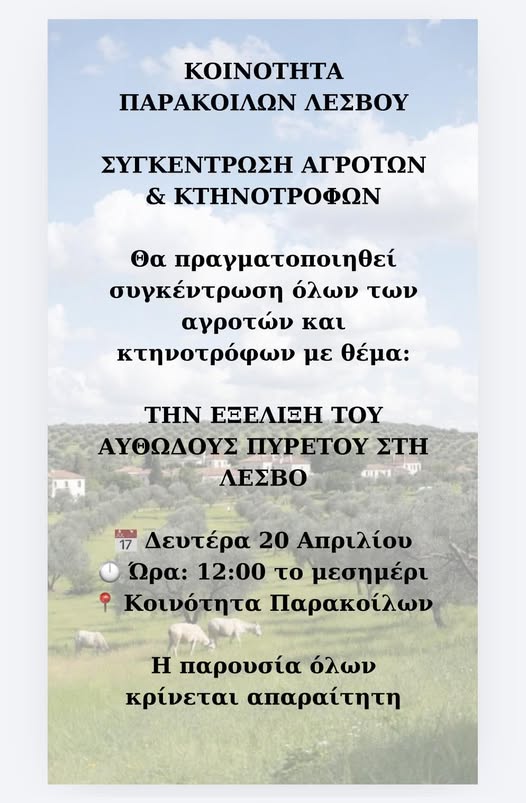 Radio Kalloni / Νέα / ΝΕΑ ΤΗΣ ΛΕΣΒΟΥ / Στις 12:00 την Δευτέρα 20/4 συγκέντρωση αγροτών και κτηνοτρόφων στα Παράκοιλα